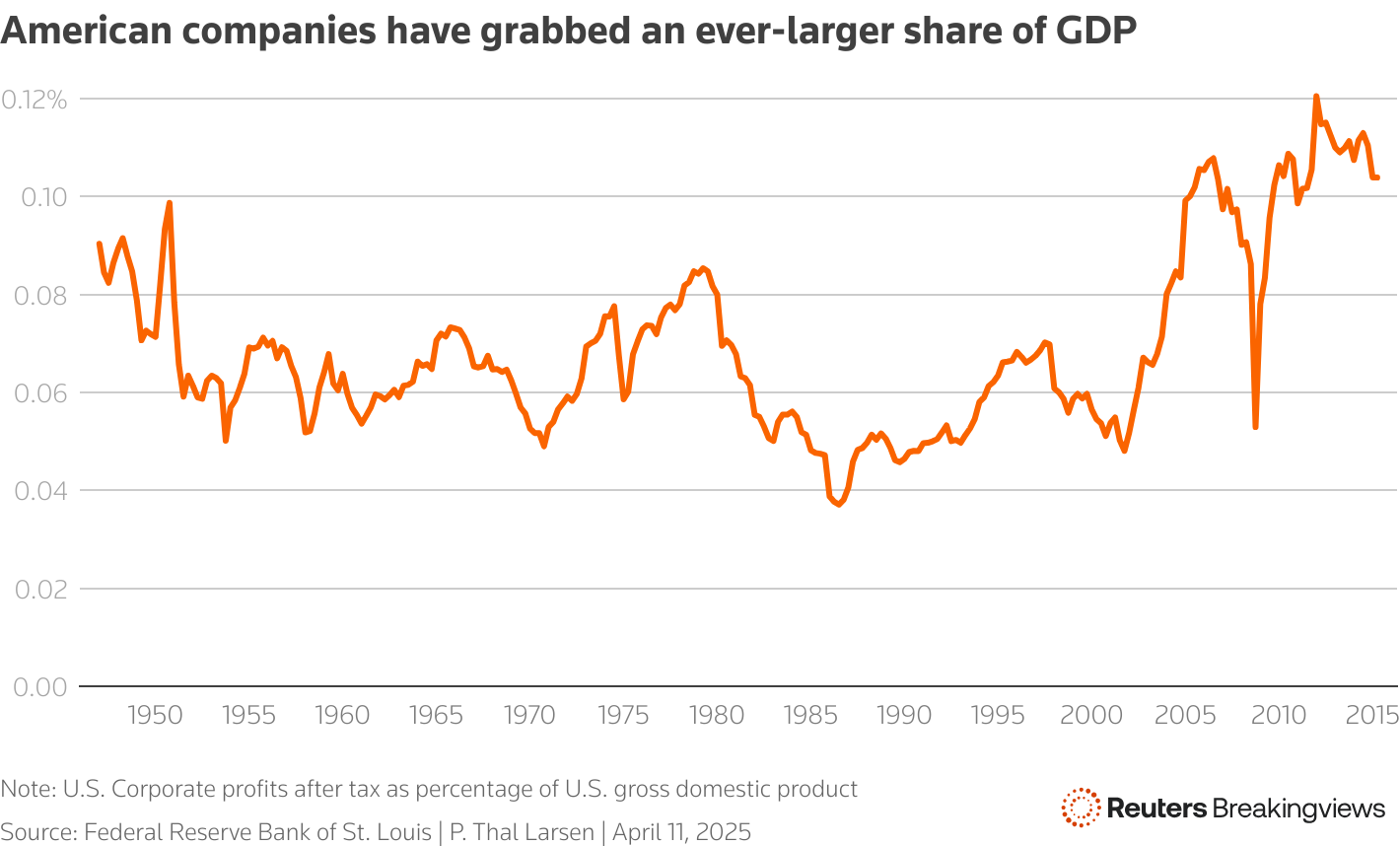 折线图显示美国企业利润占美国国内生产总值的比例上升。