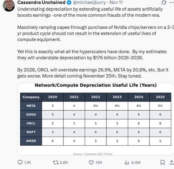根据伯里的估算,2026-2028年间,这些公司将总计低估1760亿美元的折旧。到2028年,Oracle(ORCL)的收益将被高估26.9%,Meta(META)高估20.8%,其他公司(如Microsoft、Google)情况类似。他暗示问题更严重,他会将更多细节将于11月25日公布。