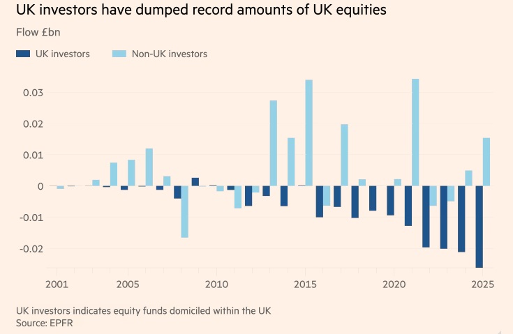 另一边,本土投资者却在加速离场——截至10月,已有约260亿英镑资金从伦敦上市股票中撤出,创下了有记录以来的年度最大流出规模。仅10月一个月,通过基金赎回流出的资金就达到34亿英镑,成为今年单月峰值。