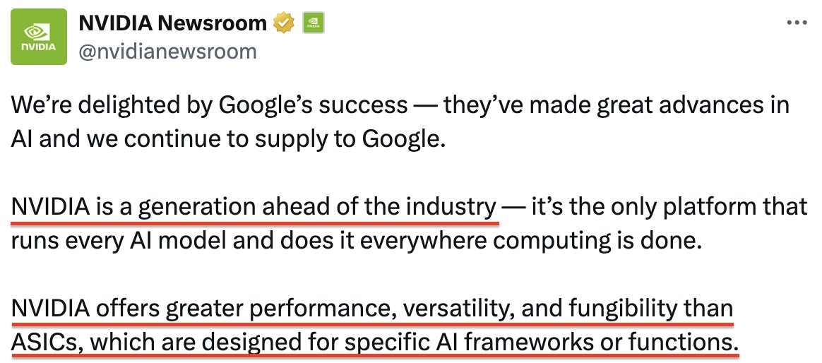 我们对谷歌的成功感到非常高兴,他们在AI领域取得了巨大进步,我们将继续为其提供产品和服务。英伟达领先业界一代,它是唯一能够运行所有人工智能模型并应用于所有计算场景的平台。与专为特定AI框架或功能设计的ASIC相比,NVIDIA提供了更高的性能、多功能性和可互换性。