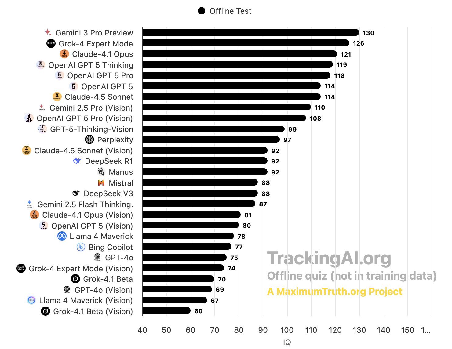 Gemini 3 pro 的智商测试在130 ,排名第一