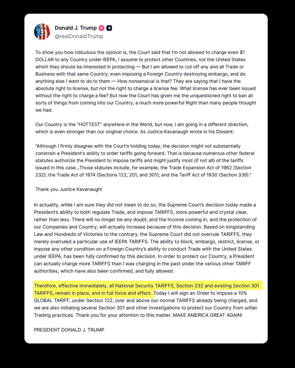 因此,立即生效,所有基于国家安全的关税、第232节以及现有的第301节关税,继续保持完整效力。今天我将签署一项命令,在我们已经收取的正常关税之上,对全球征收10%的全球关税,根据第122节,并启动几项301节调查以及其他调查,以保护我们的国家免受不公平贸易行为的影响。感谢大家关注此事。让美国再次伟大!总统 唐纳德·J·特朗普