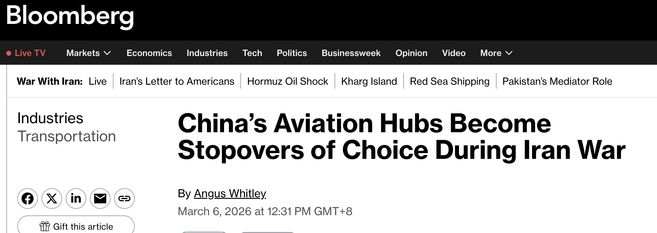 在3月6日,彭博社发布文章《China’s Aviation Hubs Become Stopovers of Choice During Iran War》(中国航空枢纽成为伊朗战争期间的首选中转站)。指出,由于战争导致欧洲-澳洲/亚洲长途航线大规模绕行中东空域,中国上海、北京等航空枢纽迅速成为热门中转站。Flight Centre Travel Group数据显示,当时经中国枢纽中转的公务舱长途旅客数量较前一周翻倍。彭博认为,这直接为中国航空公司带来客流激增和中转收入红利,使其成为全球航空业少数的阶段性赢家。