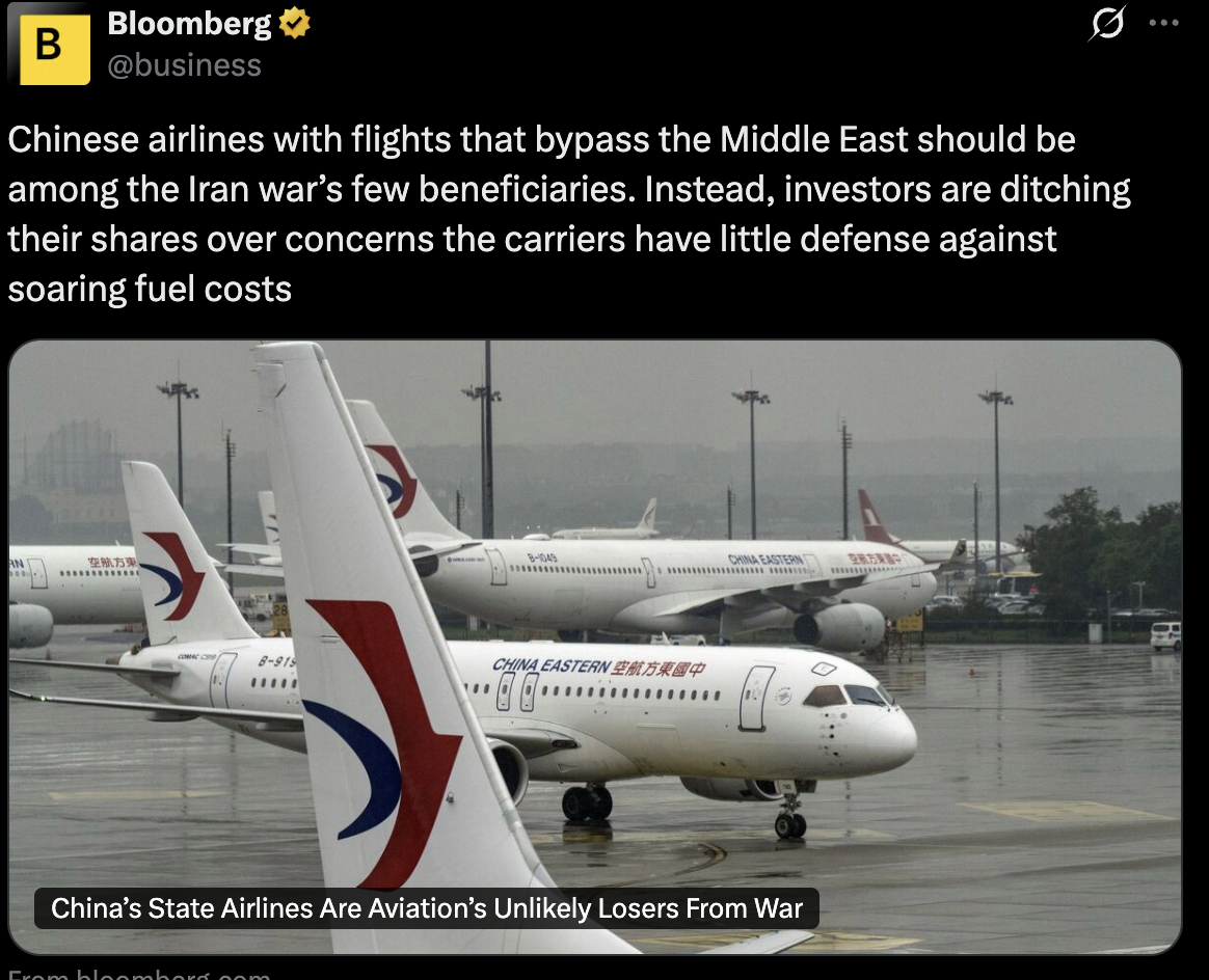 彭博社4月1日重磅文章《China’s State Airlines Are Aviation’s Unlikely Losers From War》(中国国有航空公司成为伊朗战争中意想不到的输家)文章指出,早期“受益”判断已被现实推翻。自战争爆发以来,中国三大国有航空公司香港上市股价「累计下跌至少26%」。