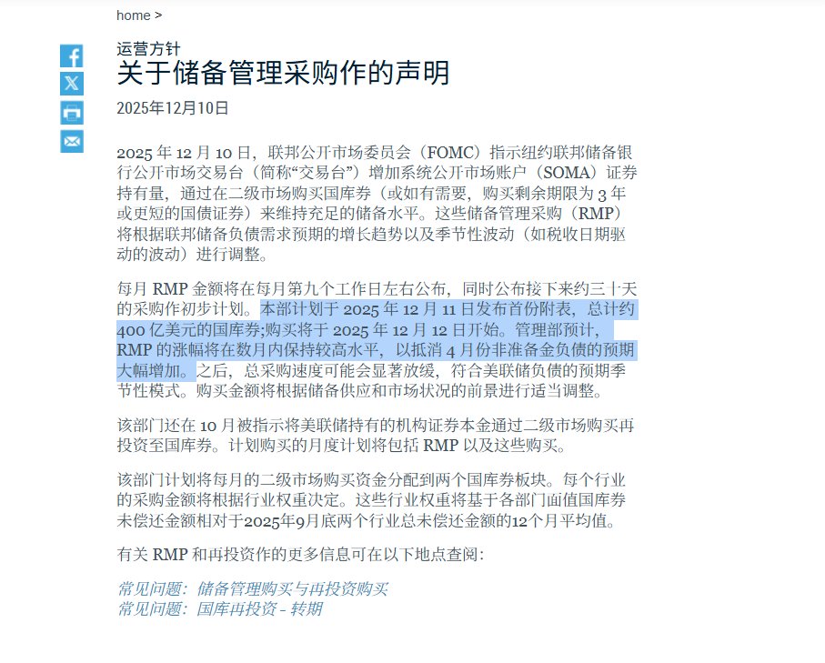 同时,美联储宣布开始购买短期国债,以确保银行体系现金充足并维持充足储备,这标志着量化紧缩(QT)正式结束,并转向储备管理操作(相当于部分扩表,避免短期借贷成本意外上升)。