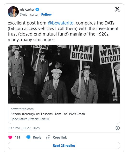 Castle Island Ventures的Nic Carter指出了历史相似之处。他引用了Be Water的一篇帖子,将今天的DAT繁荣比作1920年代的投资信托狂热,引用了许多相似之处。