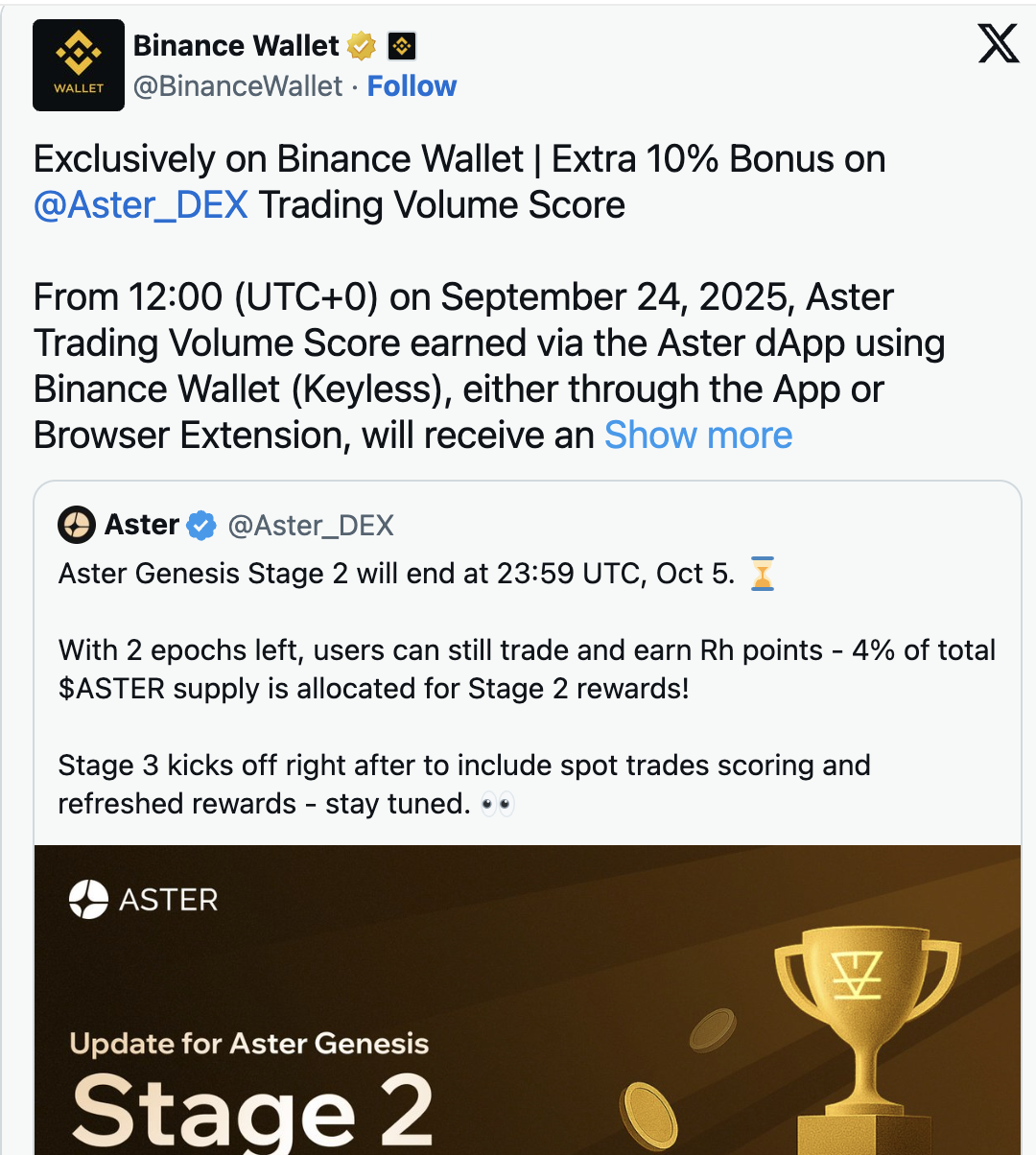 积累 ASTER 可能与平台的积分农场第二阶段程序相关,该程序激励持有和交易。