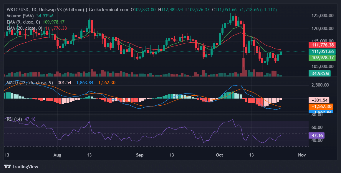 短期9日指数移动平均线(EMA)已开始向上弯曲,向20日EMA靠近,表明卖压可能正在减弱。虽然BTC尚未果断收复112K美元附近的中期EMA区域,但这一差距的缩小表明,如果买家维持控制,市场可能正在为趋势反转做准备。