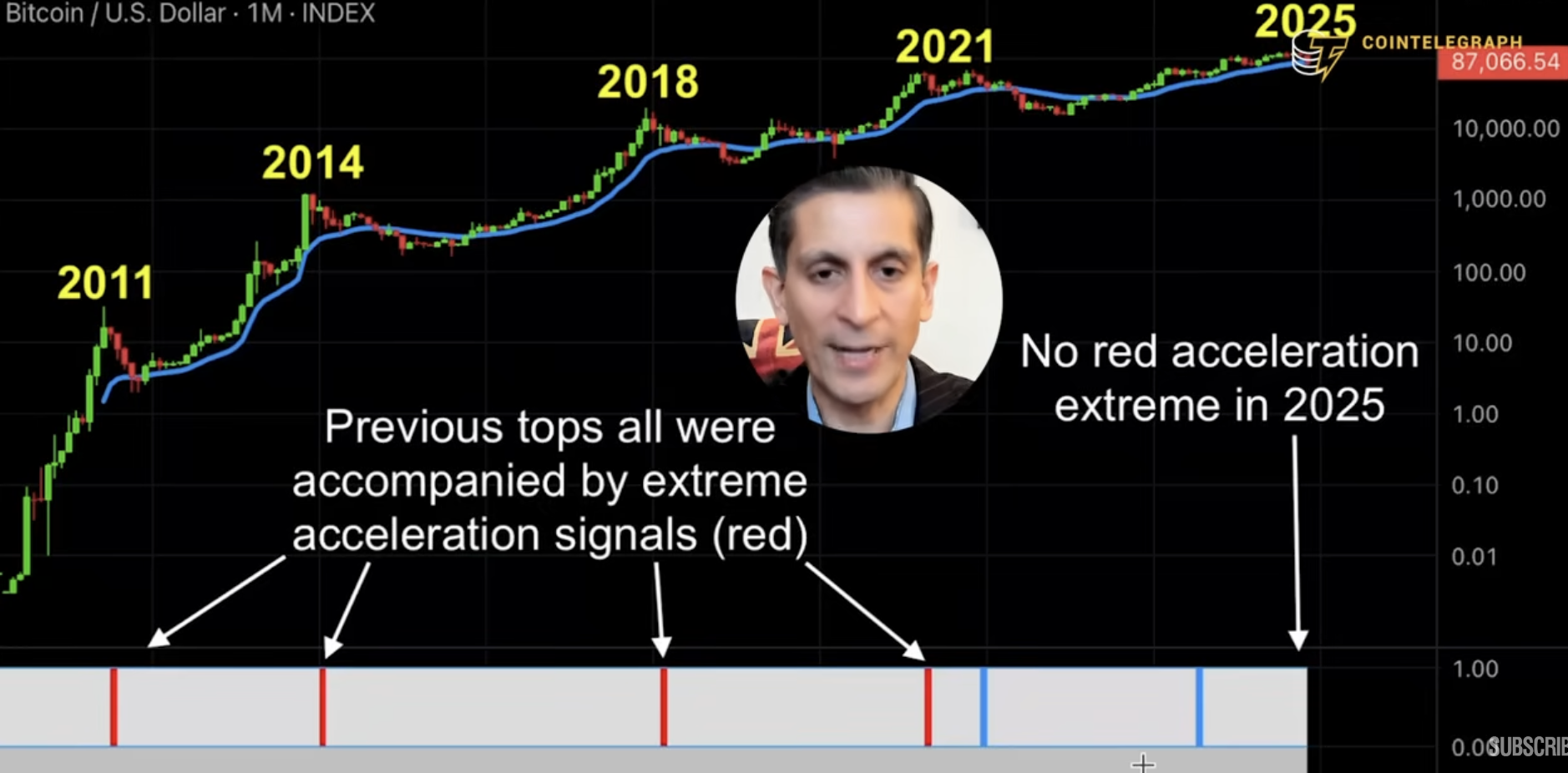 Rastani指出,过去所有大顶部都伴随图表上的红色“极端加速柱”,而今年完全没有,「这属于历史性例外」,意味着更高概率是2026年初先创新高、再出现真正吹顶。