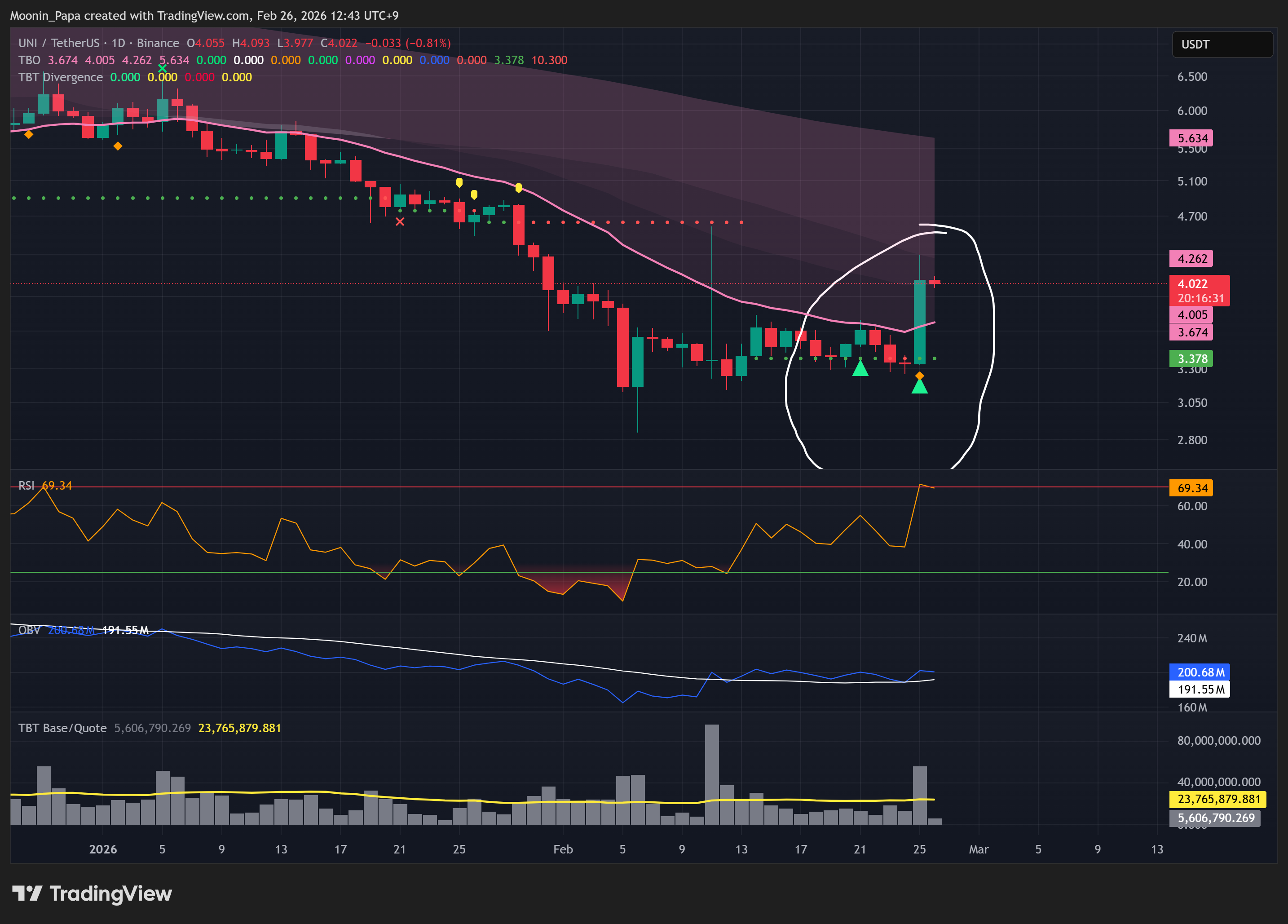 BNB 与 SOL 均拉升至每日 TBO Fast 线,成交量不规则——典型的短期挤仓特征——可能迅速耗尽动能。ADA 出现 TBT 看涨背离,但 Slow 线下行趋势未改,宏观仍偏空,削弱了反转信号。HYPE 上影线触及上方阻力未能收盘;UNI 与 DOT 打印 TBO Close Shorts(看涨反转信号),但鉴于整体下行趋势与不稳定成交量,仍需高度谨慎。
