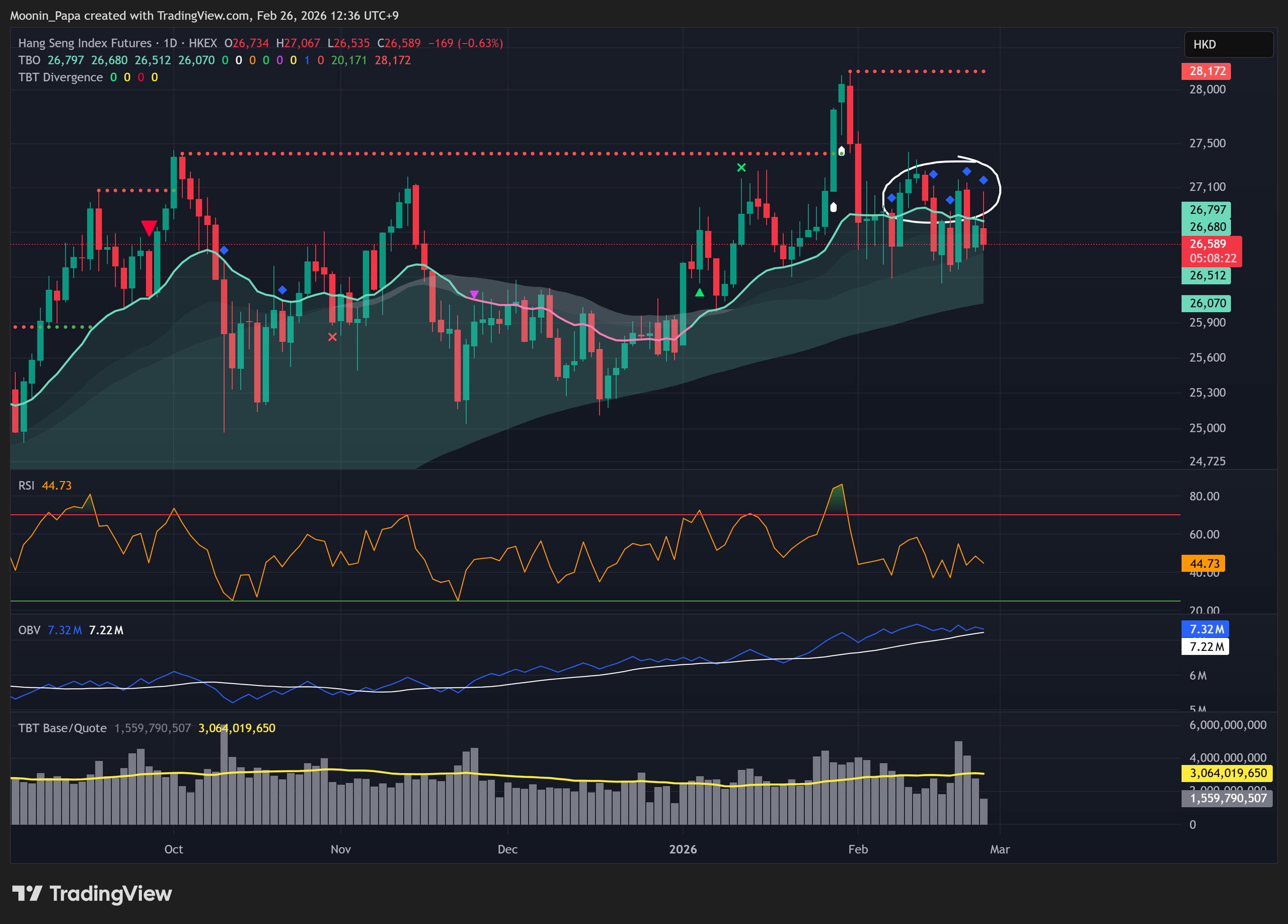 美元指数回撤至每日 TBO Fast 线,标普500期货反转形成 TBO Open Long 并逼近云层阻力。VIX 近期出现 TBT 看空背离,暗示顶部形态,通常预示股市随后出现看涨脉冲。尽管市场仍普遍看空,道琼斯工业指数仍收于 TBO Close Long,纳斯达克100跳空高开,部分得益于英伟达强劲财报及芯片板块持续需求。