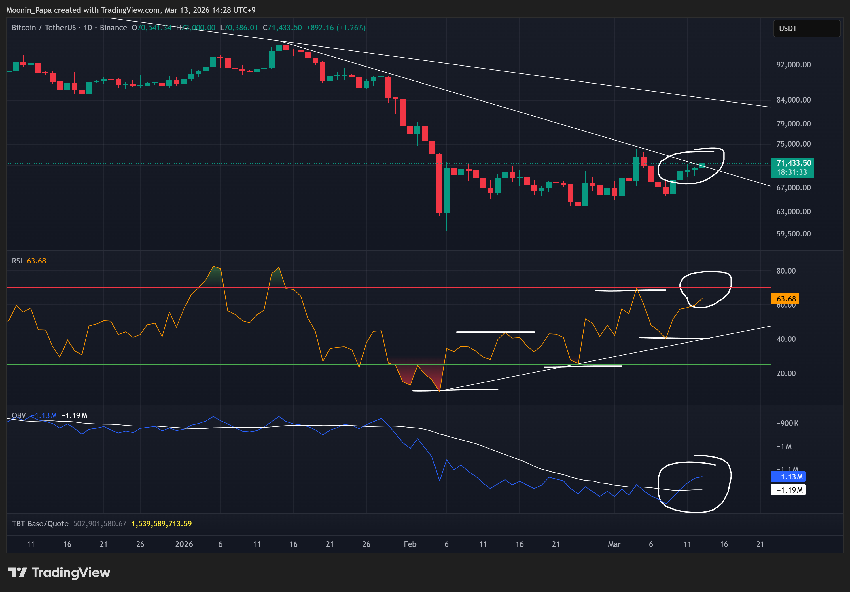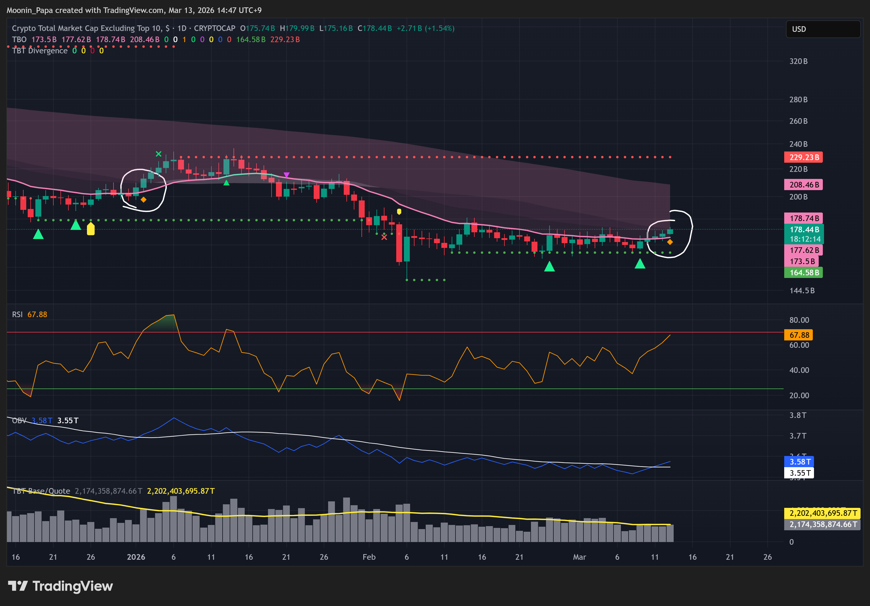 TOTALES已连续三天每日收盘高于其第一阻力扇线;今天维持将确认突破,RSI接近超买水平。同时,OTHERS正在打印TBO收盘做空,这是另一个看涨反转线索,尽管市场参与者应注意RSI过度延伸的风险以及类似于1月峰值的潜在退出信号。