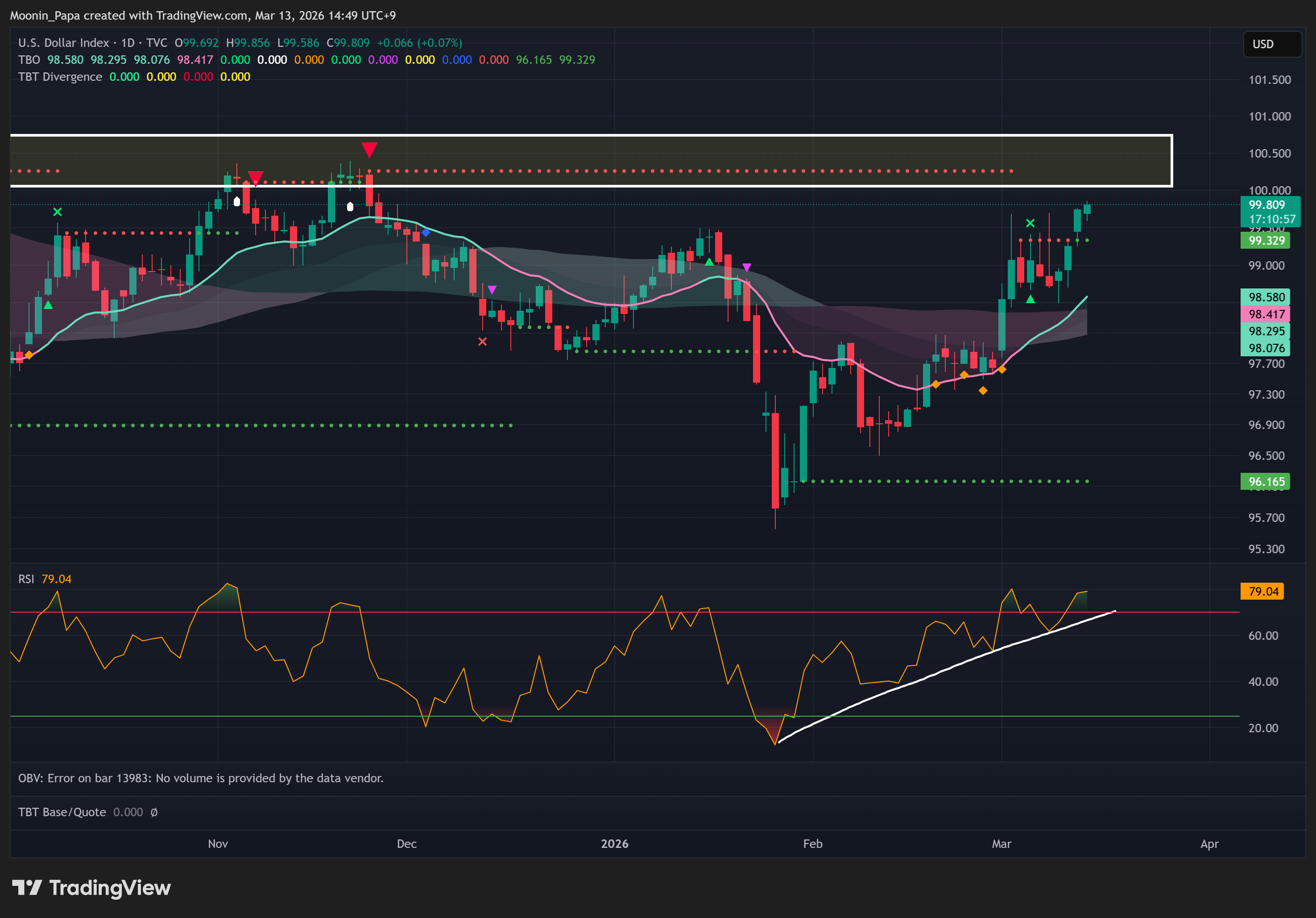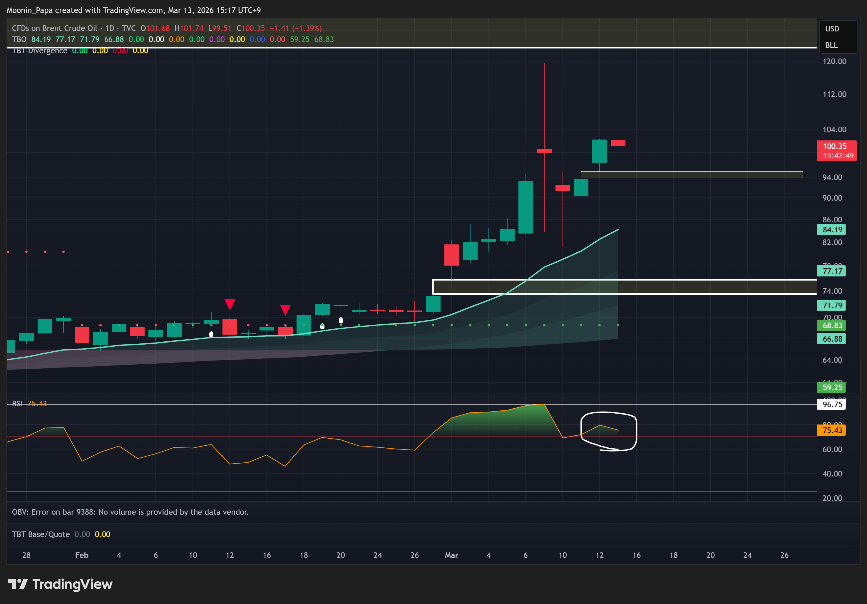 布伦特原油(UKOIL)重新测试100美元关口,并在93.80美元留下一个开放缺口。其每日RSI相对于3月9日的96.75峰值形成了较低高点,表明上行动能减弱。黄金在其每日TBO云内收盘,已转向看跌盘整阶段,成交量下降。尽管在更广泛的股票抛售中可能表现出相对韧性,但自2020年以来的抛物线上涨值得警惕。