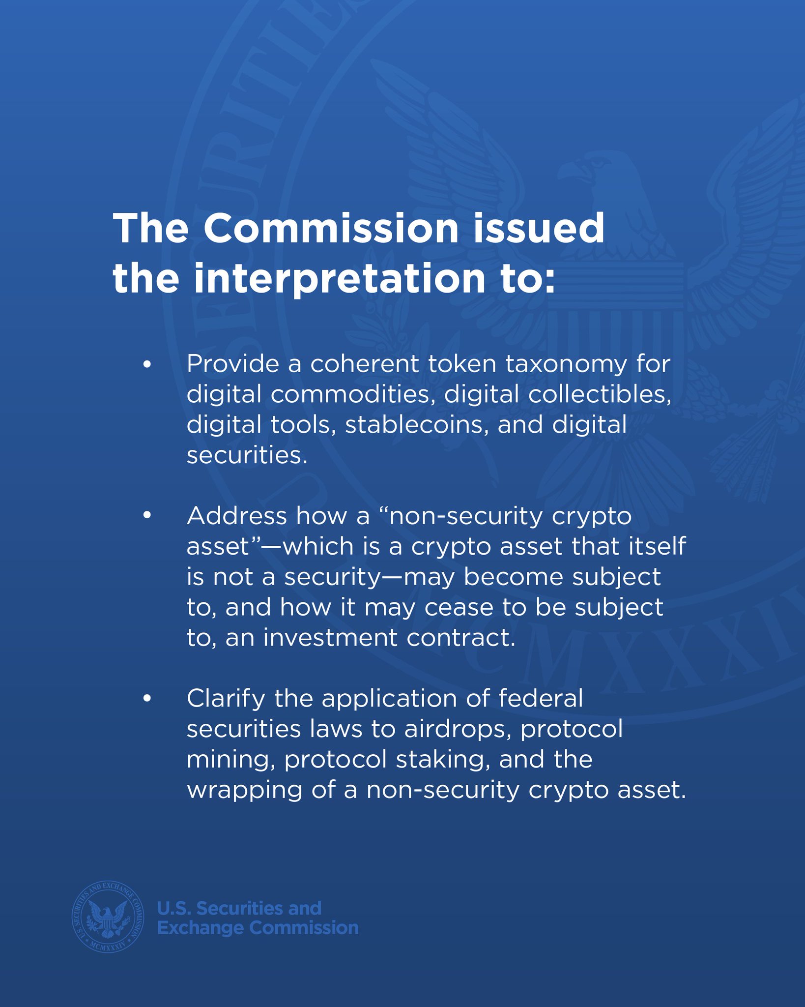 “In addition to providing greater clarity regarding the Commission’s treatment of crypto assets, today’s interpretation complements Congressional efforts to codify a comprehensive crypto market structure framework into statute.”