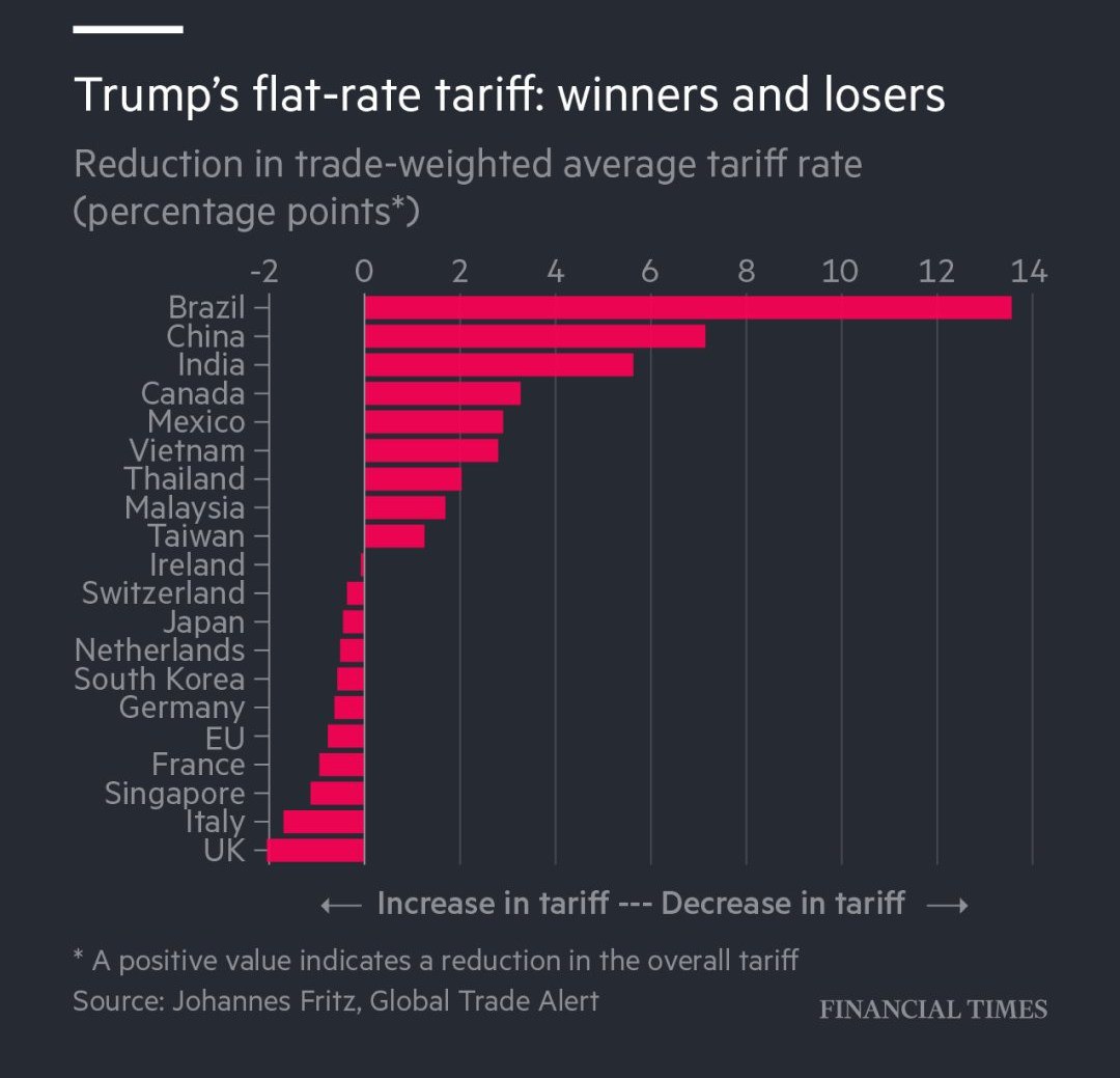 《金融时报》的图表显示,在新15%平税下,巴西和中国关税减少幅度最大,分别约13和11个百分点。中国作为最大赢家,原有针对其电子、机械等产品的关税高达25%以上,现在统一15%相当于大幅降税。这将降低中国出口成本,刺激对美贸易增长。中国商务部表示正评估裁决,并敦促美方取消剩余单边关税。巴西受益于大宗商品出口,如大豆和铁矿石,原关税较高,新政为其提供缓冲。