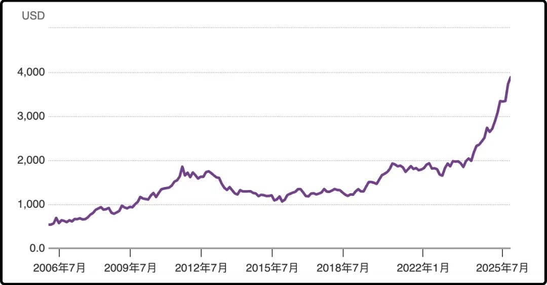 进入2020年代,黄金价格再度展现强势反弹态势。2020年新冠疫情引发全球经济衰退,恐慌情绪下避险资金大量涌入黄金市场,同年8月黄金价格突破每盎司2000美元大关,最高触及每盎司2069美元,全年回报率达25%,这一涨幅背后,是全球央行大规模刺激政策带来的流动性宽松与市场对经济前景的担忧。2022-2023年,俄乌冲突升级、中美贸易摩擦持续等地缘政治风险加剧,叠加全球通胀压力高企,进一步支撑黄金价格稳步上行。2024年黄金年回报率约27%,2025年涨势依旧强劲,上半年累计涨幅已达27%,9月价格创下每盎司3700美元的新纪录,截至2025年10月,价格稳定在每盎司约3886美元,较2000年初实现跨越式增长。