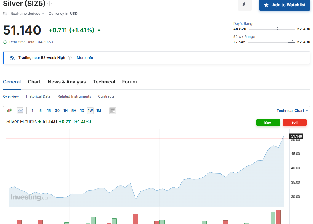 截至周一,现货白银今年累涨超56%,现货白银累涨超59%。纽约期金今年累涨约57%,纽约期银累涨近75.9%。