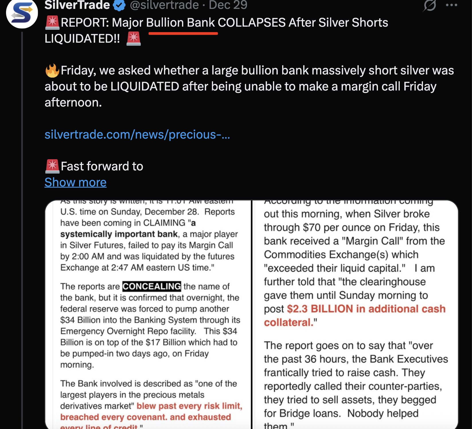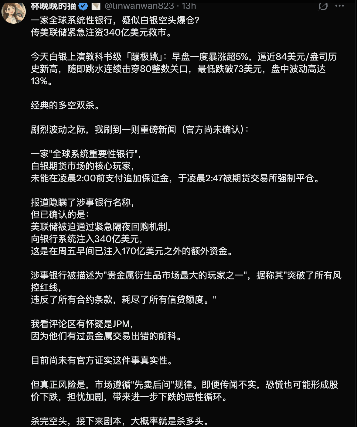 周末X平台、Reddit流传谣言称一家大型银行白银空头巨亏,无法补足23亿美元保证金,被强制平仓,甚至引发美联储应急干预。 传闻虽病毒式传播并刺激抛盘,但经主流机构(Fed、CME、SHFE)查证,缺乏实质证据,属未经确认谣言。无银行崩盘或系统危机报告,更多系对保证金上调的误读放大。