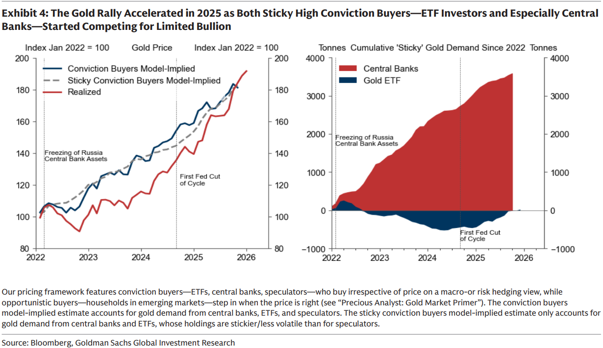 高盛还预计2026年美联储将进一步降息50个基点,尽管西方ETF持仓自2025年初以来已增加约500吨,已超过仅基于美国利率下调的预测。