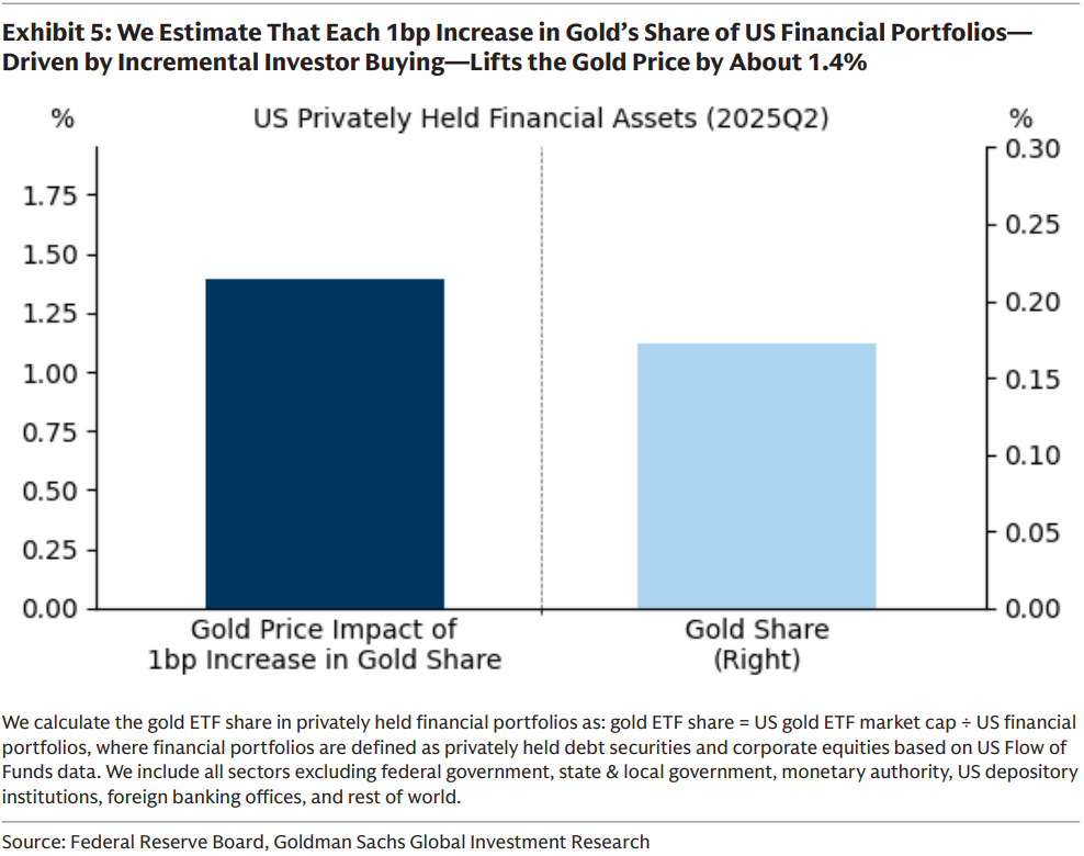 “黄金ETF仅占美国私人金融投资组合的0.17%,比2012年峰值低6个基点,”他们指出。“我们估计,美国金融投资组合中黄金占比每增加1个基点——由增量投资者购买而非价格升值驱动——将推高黄金价格1.4%。”