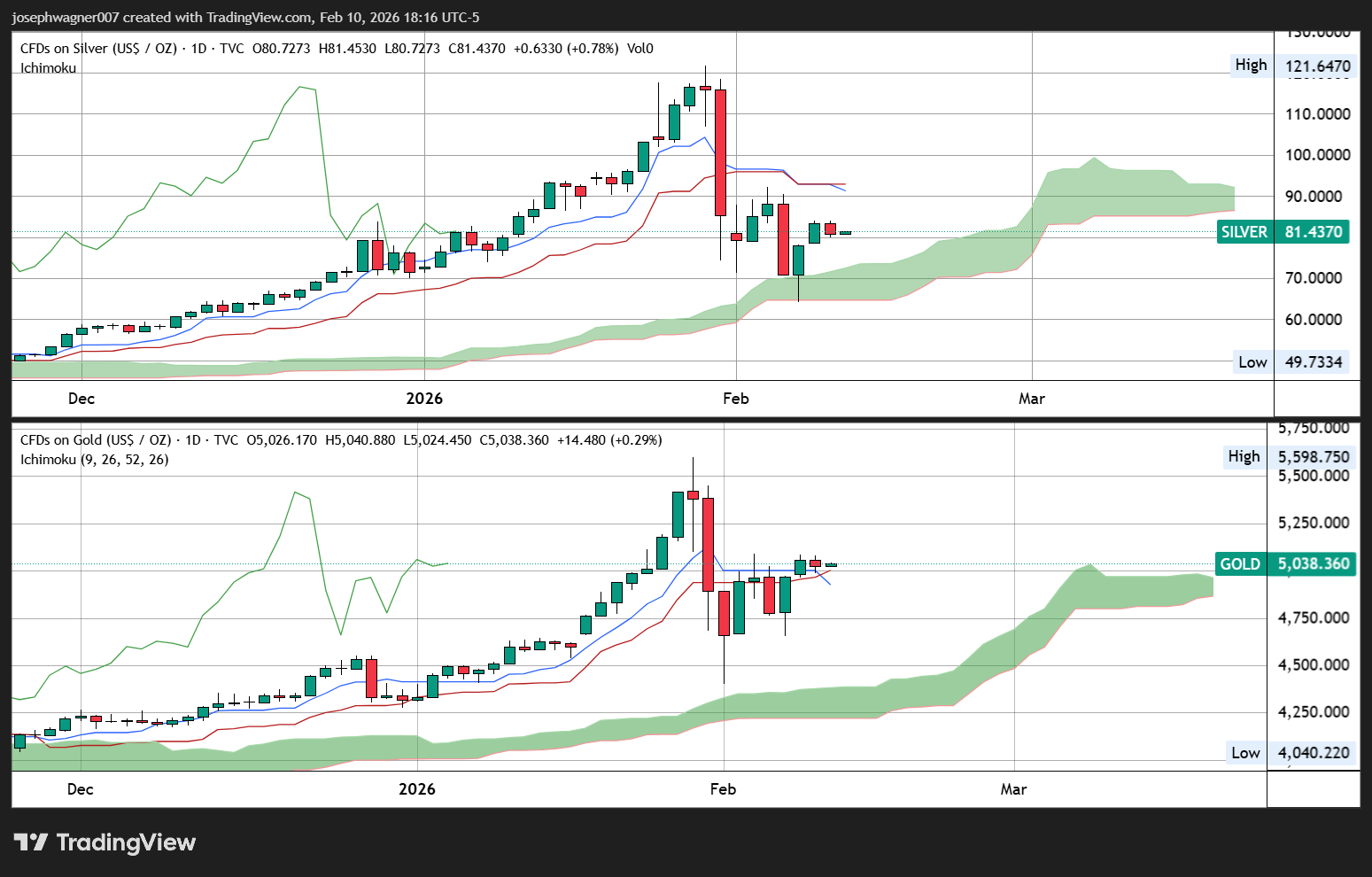 现货黄金和白银市场则呈现更为谨慎的图景,基准线(红)和转折线(蓝)之间形成看跌交叉。白银的现货与期货图表显示出额外看跌信号,包括迟行跨度(绿)已穿越历史价格区域。