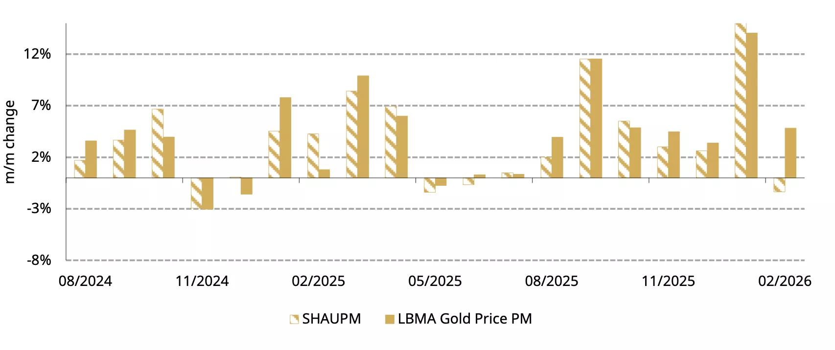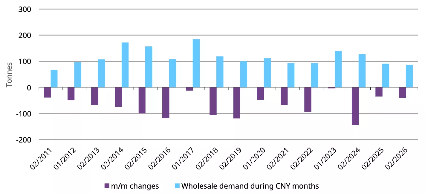 报告重点强调,尽管2026年2月正值中国农历新年(春节假期15-23日),工作日大幅减少(仅14天 vs 1月的20天),工厂和精炼厂停工延长,但批发需求仅温和下滑,整体展现出强劲韧性。这与以往春节月份的表现一致,凸显中国黄金市场在节日消费淡季仍能维持基本盘。