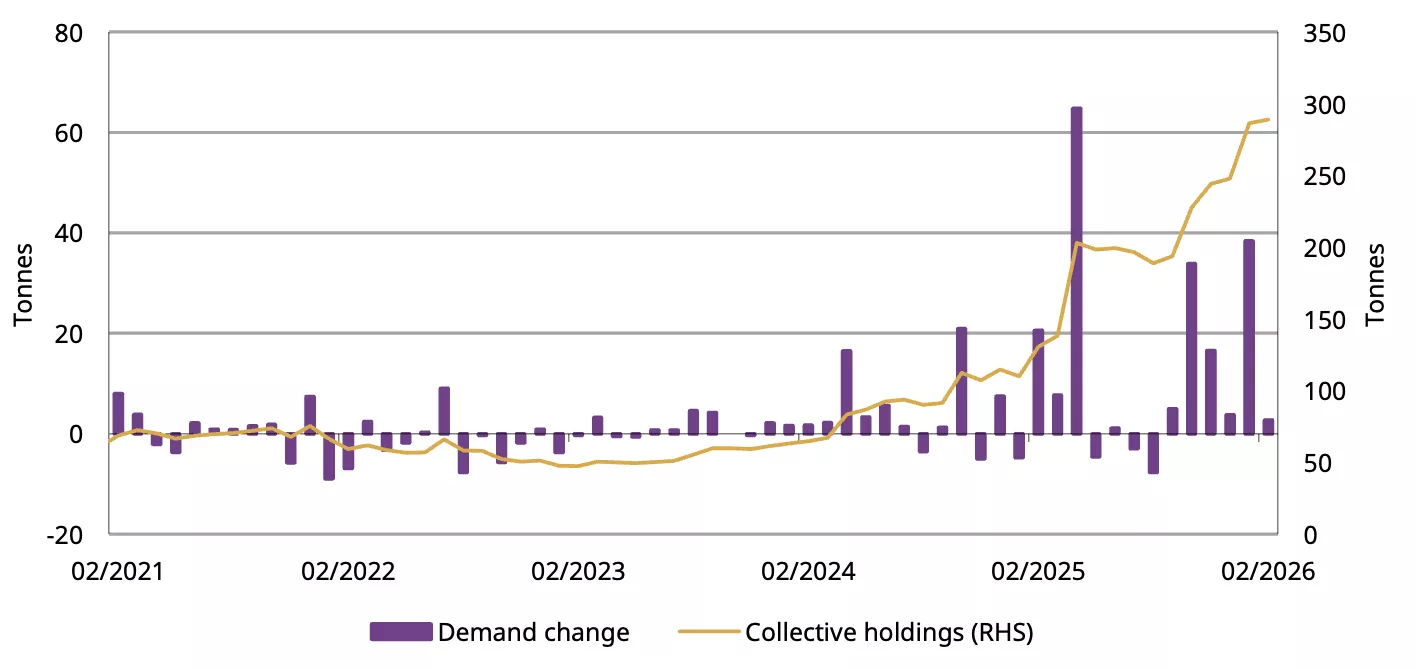 图表3:2月中国黄金ETF需求持续中国黄金ETF需求及持仓(吨)数据截至2026年2月27日。