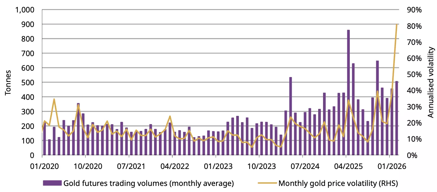 - 期货市场:上海期货交易所(SHFE)黄金期货日均成交量升至505吨(环比+11%),2月初波动期成交激增。