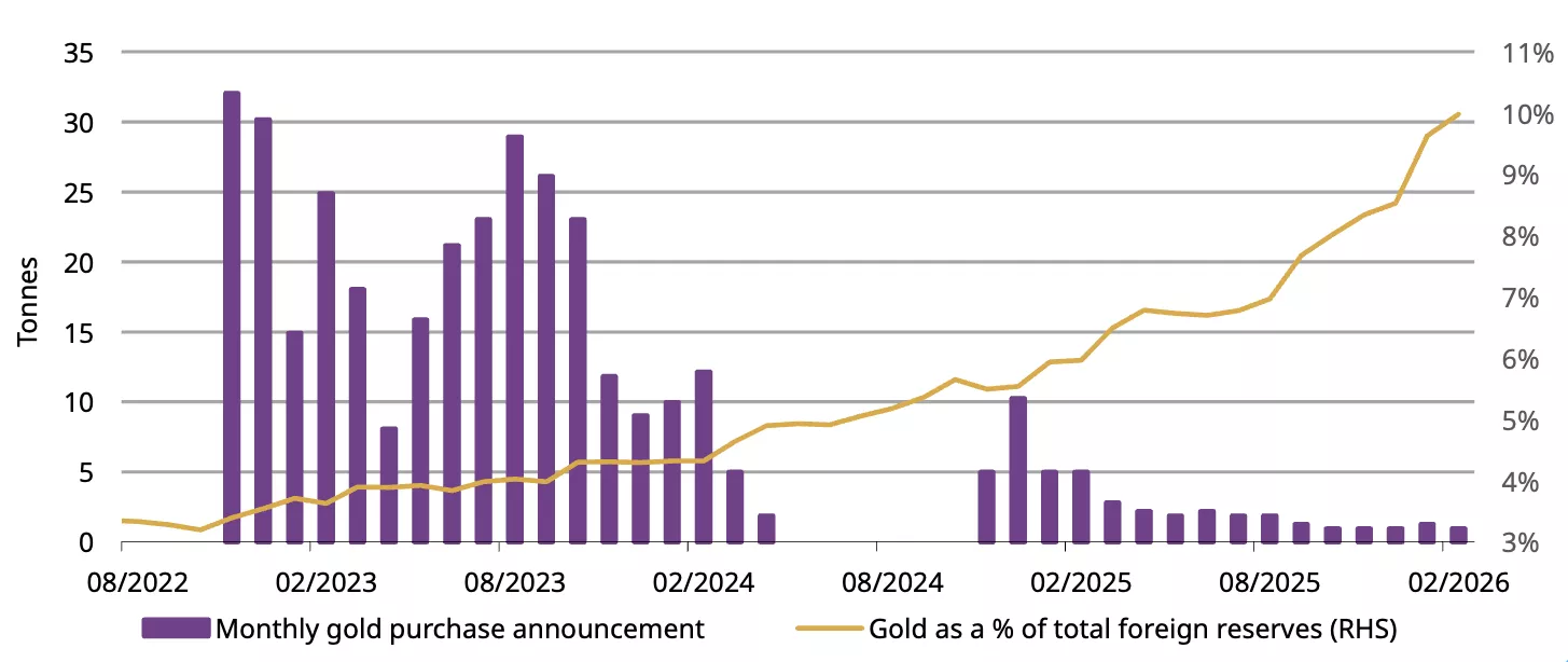 图表5:2月中国黄金储备再度增加中国人民银行报告的黄金购买量及黄金占外汇储备的比例**数据截至2026年2月。