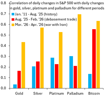 布鲁克斯接着分析了最近的抛售。“上图显示了标普500指数每日变化与各种贵金属及比特币每日变化的相关性,”他说。“蓝色柱状图是2011年1月1日至2025年8月21日的相关性。红色柱状图是2025年8月22日至2026年2月27日的相同数据。橙色柱状图则是过去六周战争期间的数据。”