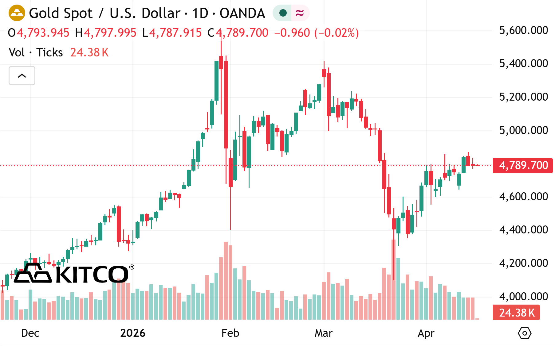 今日初请失业金数据为本已密集的新闻面增添新变量,市场正关注能源冲击是否已开始传导至美国劳动力市场。美联储下次利率决策将于4月29日举行,这是主席杰罗姆·鲍威尔任期结束前的最后一次会议。根据CME Group数据,市场目前认为利率维持在3.50%-3.75%不变的概率高达99.5%。任何来自即将上任美联储官员的鸽派暗示,或鲍威尔继任者的不确定性,都可能进一步推升金价。目前,黄金正如其全年表现一样,在充斥头条风险的一天中航行:消化多重相互冲突的信息,并稳守4800美元上方。