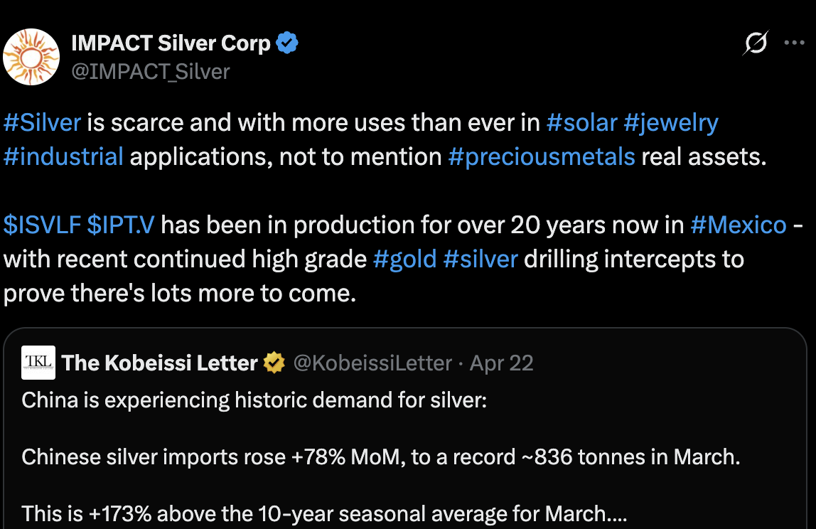 “需求激增主要由两方面驱动:一是零售投资者购买小银条,将其作为黄金的低成本替代品;二是太阳能制造商在4月1日出口退税取消前提前加紧生产,”Kobeissi指出。“全球太阳能行业每年消耗约20%的白银总供应量,而中国是其中最主要的活动区域。”