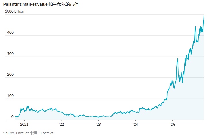 据《华尔街日报》对FactSet自1984年以来经通胀调整的数据回溯,历史上虽有20多家公司达到过类似市值,但没有一家像Palantir这样,在收入如此微薄的情况下跑得如此之快。