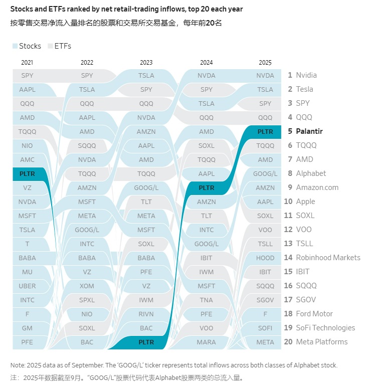 在散户交易热度榜上,Palantir今年稳居前五。播客主和YouTube博主们频频为其发声,将质疑者斥为“看不懂新时代逻辑”。面对外界对其估值的困惑,卡普毫不掩饰自己的不屑,称分析师过去同样误判了亚马逊和特斯拉,“他们总是慢半拍”。或许正是这种对传统估值框架的彻底无视,让Palantir在账面数字与市场信仰之间,走出了一条令人瞠目却难以复制的路径。