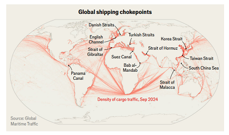 气候变化也在添乱:巴拿马运河因干旱屡次限行,北极冰盖消融可能开辟新航道,特朗普甚至以保护海道为由提出要控制巴拿马运河和格陵兰岛。