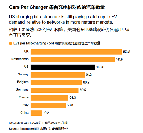 今年一季度,全美新增了605个公共高速充电站,同比增长34%。目前总数已接近13500个,比一年前多了四分之一。这个速度不算慢,但比起需求还是差了一截。彭博新能源财经的数据显示,截至今年年初,美国每根快充线对应约109辆电动车,而英国是153辆、荷兰142辆、挪威91辆、德国80辆、法国63辆,中国只有19辆。也就是说,美国充电桩的“车桩比”在发达国家中几乎是倒数的。