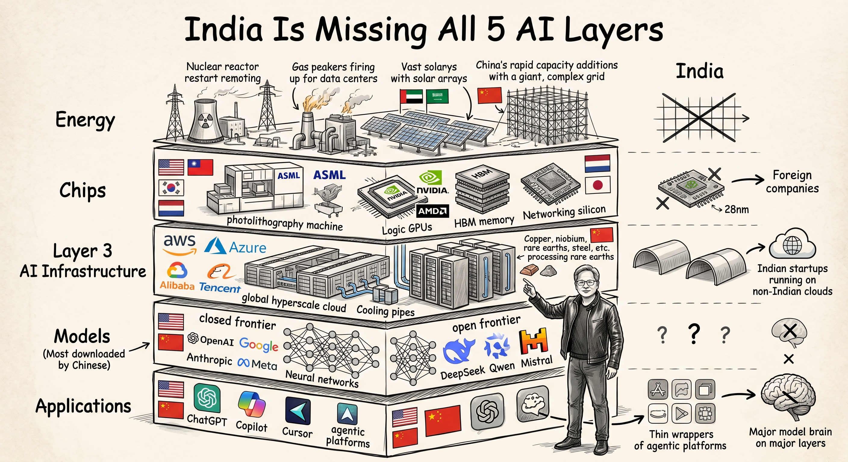 黄仁勋曾提出,人工智能产业存在五层核心价值体系,而在这一关键格局中,印度尚未在任何一层形成有效存在感,全球 AI 产业的主导权正被少数国家和地区牢牢掌控。