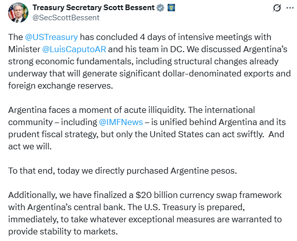 就在这个节骨眼上,一个重磅消息来了。美国财政部长斯科特·贝森特10月10日凌晨2点45分突然在社交媒体X宣布,美国要跟阿根廷央行搞一个200亿美元的货币互换框架。而且他还说了,美国财政部已经准备好,随时提供市场稳定所需要的一切支持。这消息一出来,阿根廷的美元债券立马就涨了,阿根廷财政部长卡普托也第一时间出来感谢,说这是美国的坚定支持。