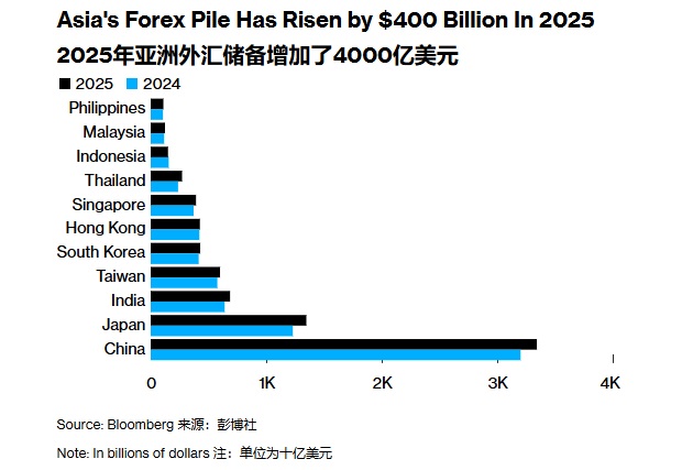 据彭博社统计,仅2025年至今,亚洲11家主要央行就合计增持了超过4000亿美元的外汇储备。这波积累并非偶然:一方面,美元在今年前九个月整体走弱,使得以欧元、日元等计价的非美元资产换算成美元后价值上升;另一方面,黄金价格持续走高,也进一步推升了以黄金计价部分的储备总值。