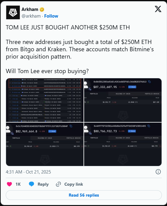 这一收购通过区块链分析平台 Arkham Intelligence 确认,BitMine 在今年最重大的市场去杠杆事件之一后,从交易所 BitGo 和 Kraken 收购了 ETH。